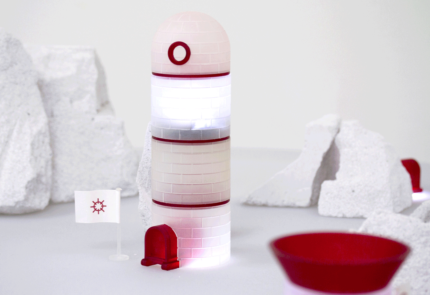 Cold Hands, Warm Hearts → This was a very enjoyable collaboration with my good friends Studio PSK. The project was created for a London Design Festival exhibition that explored 'water' as a theme. Mixing design disciples we set out to tell the story of a fictional people called The Yboviethii, a nomadic community who despite living in extremely harsh, arctic-like conditions, prioritised their mental health as much as their physical well-being. Taking the igloo as our starting point—the perfect marriage of design and water (ice) to us—we set out to create a series of playful structures with very warm intentions. Against a backdrop of climate change, advances in technology and the on-going mental health crisis, we were interested in ways our igloos could enhance life for inhabitants.